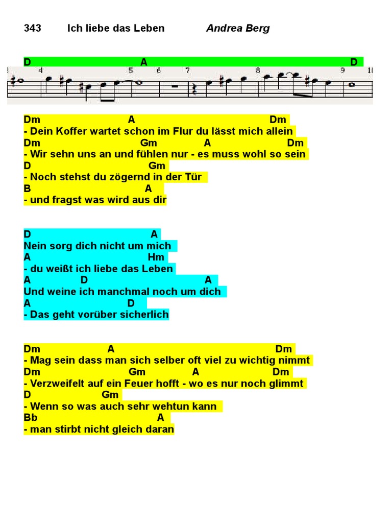 These are the chords for das leben by lea on piano, ukulele, guitar, and keyboard. E a b) das geht vor�ber sicherlich. B6bc#mc#m* glaub' mir ich liebe das leben. Ihr lieben, war gerade erstaunt, dass es hier keine einzige gute version c c/e f alles was ich tue page 1/2 dm c gestern heut und hier c c/e f soll doch nur ein umweg sein dm c auf meinem weg zu dir c c/e f alles was. Dm am (denn) ich liebe dieses leben, c g ich liebe den moment, in dem man fallt.